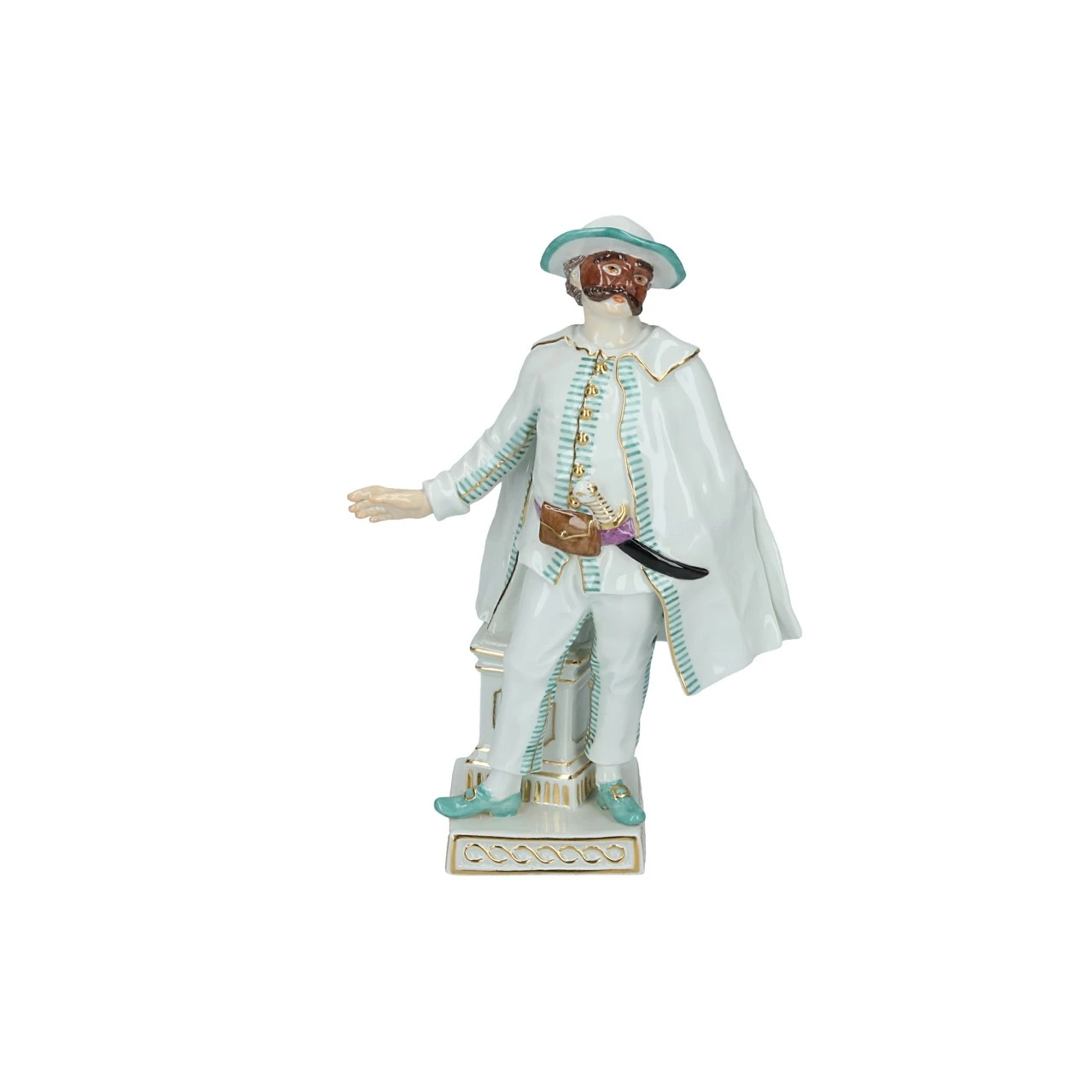 Die ersten Commedia dell´arte-Figuren der Meissener-Porzellan-Manufaktur wurden bereits um 1710/12 in rotbrauenen Feinsteinzeug (Böttgersteinzeug) gefertigt, wobei verschiedene plastische Partein teilweise poliert waren. Es handelt sich um folgende sechs: Artecchino, Pulcinell, Bringhella, Cantarina, Capitano und Pantalone. Die Modelleure dieser Kleinplastiken waren Balthasar Permoser (1651-1732), Benjamin Thomae (1682-1751) und Paul Heermann (1673-1732) – berühmte Bildhauer, tätig am Dresdner Hof. Im Schlossmuseum zu Gotha werden die kostbaren Originale heute noch verwahrt. Bevor der 24jährige Bildhauer Kaendler (1706-1775) im Jahre 1731 an die Meissener Porzellan-Manufaktur kam. lagen somit bereits Formen und Gestaltauffassungen dieser Figuren vor. Johann Joachim Kaendler, Peter Reinicke (1715-1768) Johann Friedrich Eberlein (1695-1749) und Freidrich Elias Meyer (1723-1785) schufen schließlich im Laufe der Jahre und Jahrzehnte weitere zahlreiche Figuren und in sich abgeschlossene Serien dieser Sujets. Oftmals wurden diese Schöpfungen von den Künstlern später wieder überarbeitet oder mit andersartig gestalteten Postamenten versehen. Die kunsthistorische und manufakturspezifische Aufarbeitung der Arbeiten steht noch immer aus. Die Schwierigkeit besteht darin, dass zu den jeweiligen Porzellanfiguren druckgrafische Vorlagen gefunden und benannt werden müssten, denn die Meisser Figuren enstanden – wie auch bei anderen Manufakturen – in Mehrzahl nach grafischen Vorlagen, wie z.B. nach Jacques Callot, Louis Riccoboni, Antoine Watteau, Johann Jacob Wolrab uws.